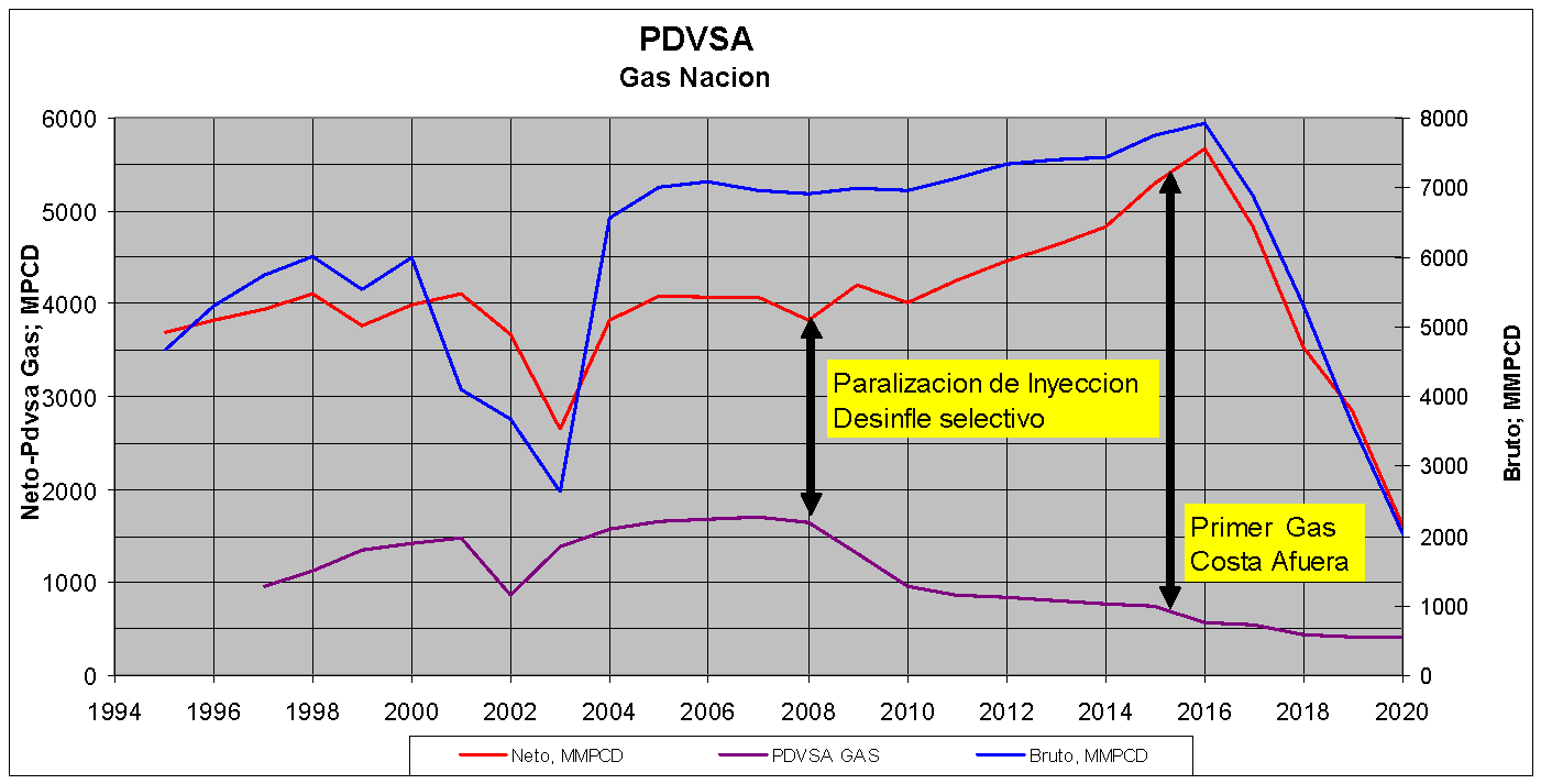 De allí que se observa un aumento en la producción de gas precisamente a partir de 2008, mientras cedía la producción de crudo convencional y la de Anaco Gas. Un aumento de producción de gas ante tal escenario es inconcebible, dado que el primer gas de Costa Afuera se recibe en Julio’2015, mientras que ningún proyecto de gas no asociado mejoraba en el país. Es decir, ese gas adicional provenía de proyectos de inyección descontinuados y de la destrucción de la producción de crudo Premium, originando un daño patrimonial sin precedentes a nuestra nación.