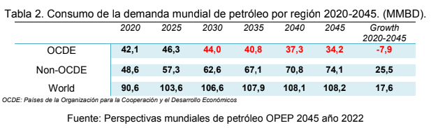 Para inferir el futuro de la OPEP y por ende de Venezuela como potencia petrolera, es menester analizar los pronósticos de consumo de crudo, considerando el informe de proyección mundial de petróleo 2045 presentado en la tabla 2, donde indican un crecimiento en la demanda de 17,6 MBD entre los años 2020 y 2045. Este panorama de demanda de crudo, permite suponer un incremento de la cuota de cada país perteneciente a la alianza OPEP+ que le permita en consenso aportar el petróleo que necesita los diferentes sectores productivos de las economías del mundo.