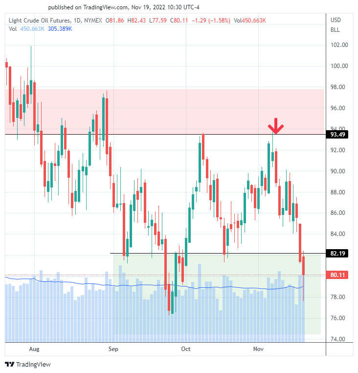 El petróleo cotiza en un rango entre 78 y 93 dólares desde agosto. El resultado electoral en EEUU, que no significó una paliza para los demócratas, trajo una recuperación del dólar y caída del petróleo (Flecha roja). En ello también ayuda el enfriamiento de la economía de China. La Reserva Federal ya está agotando sus "cartuchos" para revalorizar el dólar en su lucha contra la inflación. La caída de los bonos de deuda de EEUU, es una alarma que permite prever, que la FED está cerca de sus límites. Entonces queda el mercado petrolero, real. En esta parte es que entra la situación de Venezuela.