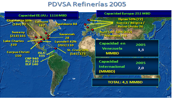 Ese logro ha quedado registrado en los resultados de la adquisición, a partir de 1983, de 19 refinerías chatarra para "asegurar el mercado" para la duplicación de los niveles de producción, desde 3 hasta 6 ó 7 millones de barriles diarios, los cuales serían producidos partir de los 303 mil millones de barriles de supuestas reservas probadas, mayoritariamente extrapesadas y ubicadas en la Faja Petrolífera del Orinoco.