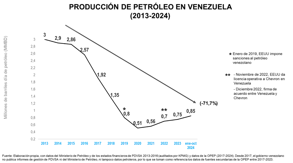 Pero a partir del 2015 y, sobre todo, luego de la militarización con el General Quevedo en 2017, la producción cayó hasta 1,15 millones de barriles día (enero 2019) y luego llegaría a 330 mil barriles diarios con Tarek El-Aissami. A partir de la entrega de la producción a Chevron, desde enero del 2023 se ha incrementado en 200 mil barriles día, un volumen que no paga regalías, ni impuestos; es decir, es un negocio de la transnacional y del madurismo.