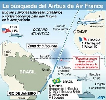 En la madrugada de este martes un avión R99 había detectado señales electrónicas que indicaban material flotando. Ya en la mañana, una aeronave confirmó visualmente que había pedazos (incluyendo una butaca de avión) en el agua. Sin embargo, alrededor de las 12h30 locales de Brasil (15H30 GMT) otras aeronaves hallaron "una franja que se extiende por cinco kilómetros con restos. Son cables y elementos que componen la aeronave".