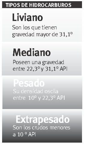 Según esta clasificación, el petróleo puede ser liviano o ligero, mediano, pesado oextrapesado. Cuanto más ligero es un crudo, mayor es su número de grado API.