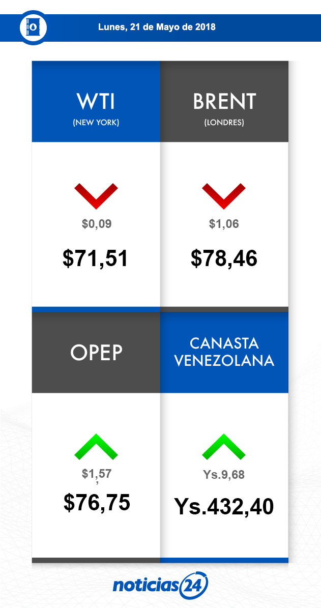 21 mayo 2018 - Los precios de los petróleos marcadores mostraron una tendencia a la baja producto de informes que hablan de volúmenes de crudo que provienen de nuevos oferentes. Adicionalmente se ha conocido de conversaciones entre La India y Arabia Saudita, en aras a un acuerdo de suministro a largo plazo a precios estables, en bandas de precios que serían menores a las actuales.