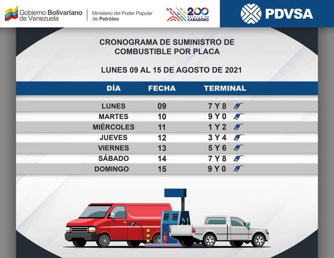 Aquí te presentamos el cronograma de suministro de gasolina por placa para la semana del lunes 09 al domingo 15 de agosto de 2021: