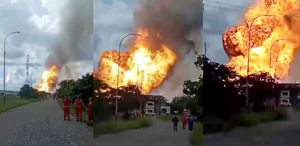 12-11-24.-Cinco personas resultaron heridas este lunes debido a la explosión de un gasoducto de la estatal petrolera Pdvsa en el estado Monagas, tras lo cual se produjo un incendio que está siendo combatido por bomberos en el Complejo Operativo Muscar, donde se desplegaron otros funcionarios de seguridad y rescate, informó el gobierno.
