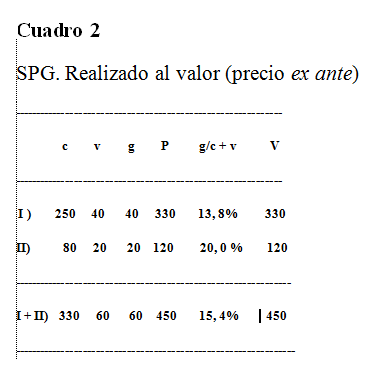 Esta transacción, desventajosa para el sector II, que entrega más valor que el que recibe, va con cargo al sacrificio parcial de su plusvalor particular, pues, en vez de consumir un valor de 20 en bienes de consumo (Cuadro 2, columna “g” ), apenas consume su plusvalor reducido al valor de 15,4 (Cuadro 3, columna “p y g” derecha). Ekl valor de plusvalor que sacrifica el Sector II va con cargo al sobreprecio o precio de producción que este sector paga por un valor de medios de producción cuyo valor es igual a 80 (columnas “v” y “p y g”-I).