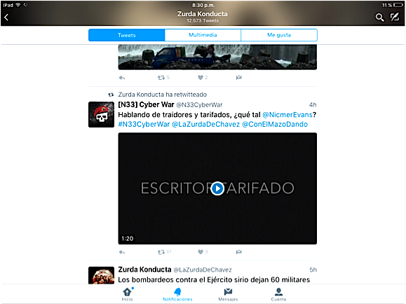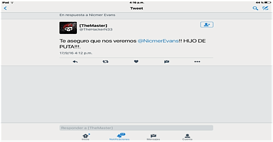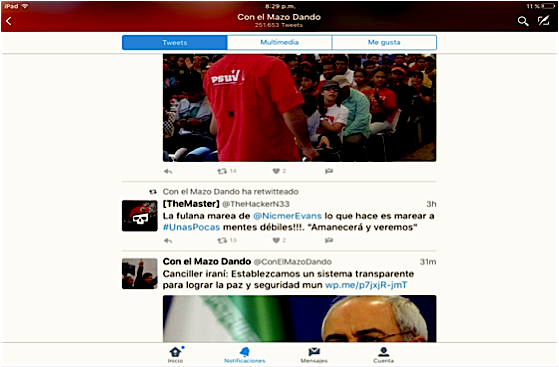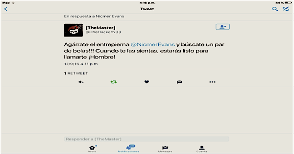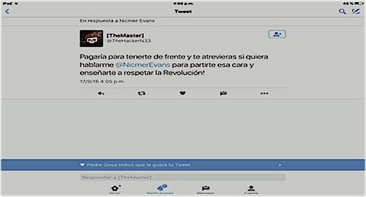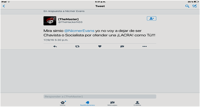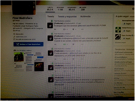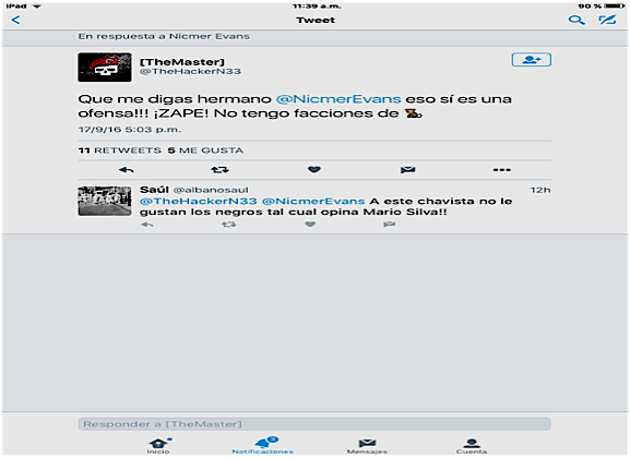 Que de manera simultánea a los escritos descontrolados de Almeida a través de una de sus cuentas, eran replicados, apoyando de manera clara las opiniones de un racista, homófobo y acomplejado, que en nombre de Chávez utiliza delitos informáticos para descalificar a otros con plena impunidad.