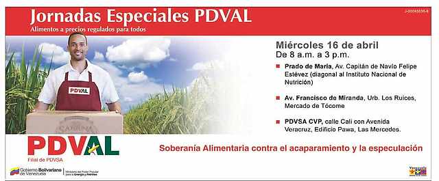 Caracas, 16 Abr. (Aporrea.org) .- A través de la empresa Producción y Distribución Venezolana de Alimentos (Pdval) se impulsa una de las políticas alimentarias del Gobierno Nacional para erradicar el acaparamiento, donde se espera abastecer a la población con diversos productos de la cesta básica.