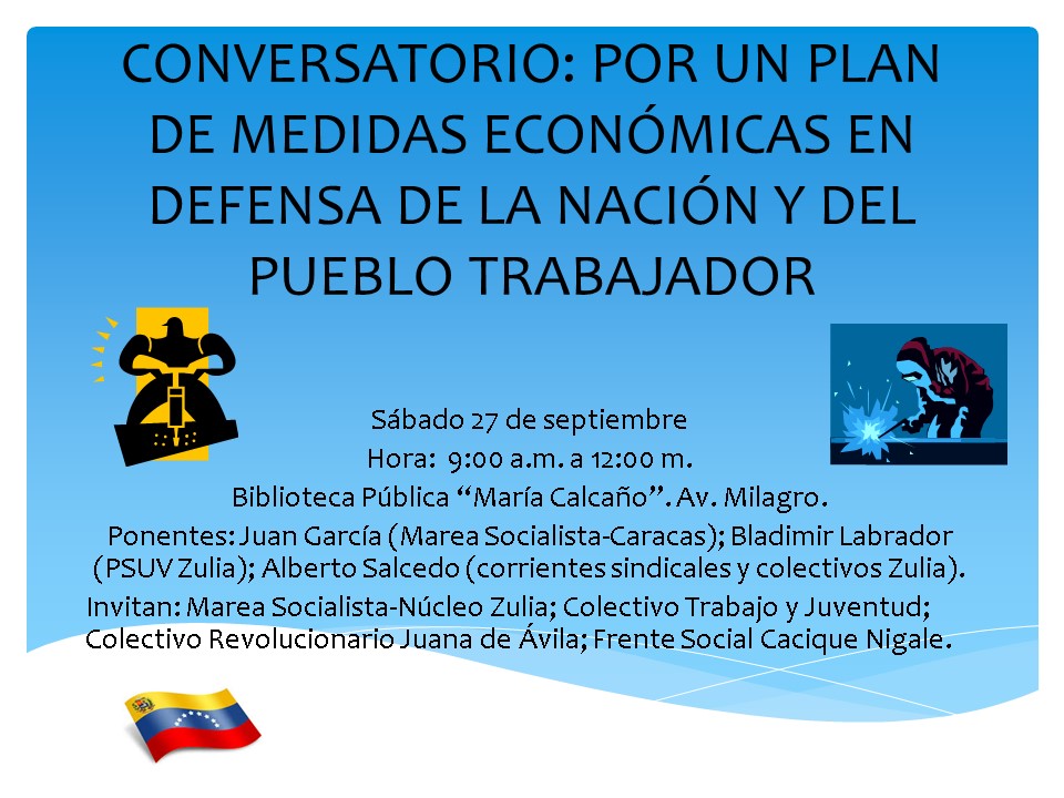 El sábado 27 de septiembre desde la 9 am, se realizará en la Biblioteca Pública María Calcaño, el Conversatorio Medidas Económicas en Defensa de la Nación y del Pueblo Trabajador.