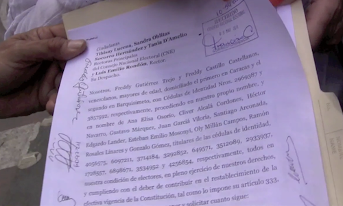 Nosotros, Freddy Gutiérrez Trejo y Freddy Castillo Castellanos, venezolanos, mayores de edad, domiciliado el primero en Caracas y el segundo en Barquisimeto, con Cédulas de Identidad Nros. 2969387 y 3857592, respectivamente, procediendo en nuestro propio nombre, y en nombre de Ana Elisa Osorio, Clíver Alcalá Cordones, Héctor Navarro, Gustavo Márquez, Juan García Viloria, Santiago Arconada, Edgardo Lander, Esteban Emilio Mosonyi, Oly Millán Campos, Ramón Rosales Linares y Gonzalo Gómez, titulares de las cédulas de identidad, 4056575, 6097211, 3714184, 3292852, 649571, 3512089, 2933937, 1728557, 6898671, 3534952 y 4256854, respectivamente, todos en nuestra condición de electores, en pleno ejercicio de nuestros derechos, y cumpliendo con el deber de contribuir en el restablecimiento de la efectiva vigencia de la Constitución, tal como lo impone su artículo 333, nos dirigimos a ustedes para exponer y solicitar cuanto sigue: