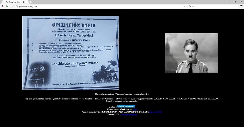 Agosto 07 de 2017.- La "Operación David" es el nombre de las acciones dirigidas en los ataques que desde la mañana del día lunes han sufrido varias páginas institucionales, destacan que su lucha es digital: "Tú trancas las calles y nosotros las redes", dicen en un mensaje que se lee al abrir los sitios en internet del Consejo Nacional Electoral (CNE), el Tribunal Supremo de Justicia (TSJ), la Asamblea Nacional (AN, Parlamento), CONATEL, Cuerpo de Investigaciones Científicas, Penales y Criminalísticas (CICPC).