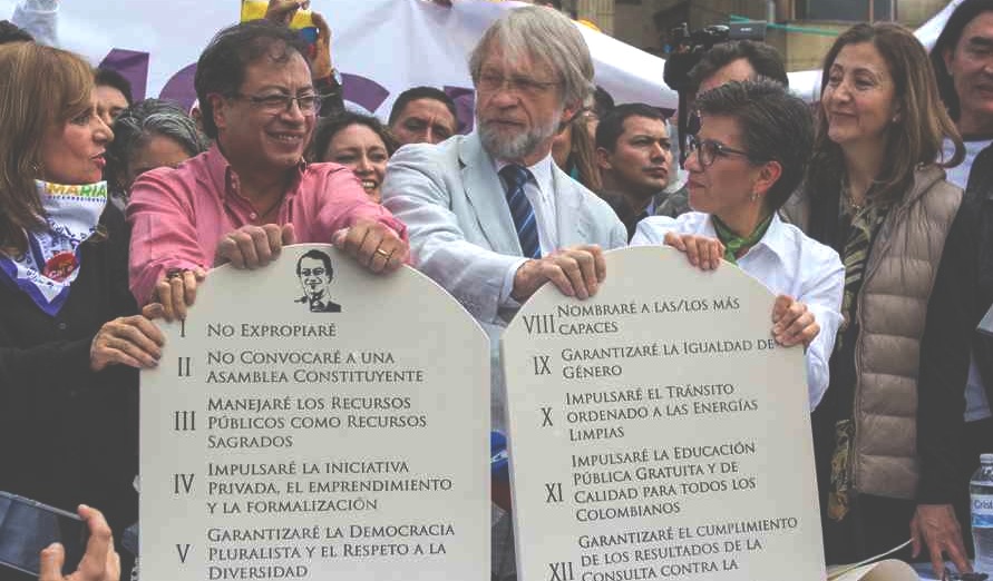 Al Voto Nacional llegaron el viernes Petro, Claudia López, Antanas Mockus, Angélica Lozano, Ángela María Robledo, María José Pizarro. Mockus le preguntó a Petro si juraba cumplir con 12 mandamientos. "No expropiaré", "No convocaré a una Asamblea Nacional Constituyente", eran dos de ellos. La imagen de todos se convirtió en un momento simbólico de esta carrera por la presidencia. En últimas, la unión de estos personajes alrededor de Petro intentaba disipar dudas frente a los extremismos de que lo acusan.