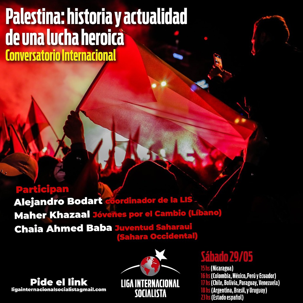 Con la intervención de Alejandro Bodart coordinador de la LIS,  Chaia Ahmed Baba de Sahara Occidental y Maher Khazaal de Líbano, activistas del mundo árabe y militantes de la causa palestina, a los que les podrás hacer preguntas o transmitir tus opiniones.