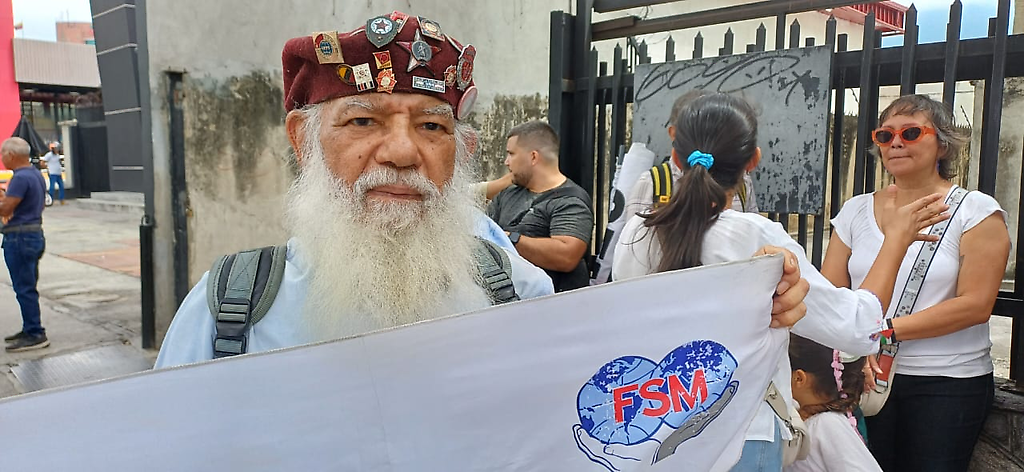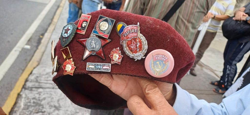 28-09-25.-Para Miguel Monserrat la revolución, la idea de un cambio político para una vida mejor, se lleva en la cabeza y en el corazón. En la cabeza van las ideas, pero también, los sellos de la ya desaparecida Unión Soviética (URSS) que adornan su boina roja. El corazón, por la voluntad de acompañar las movilizaciones que considera justas en la Venezuela de hoy.