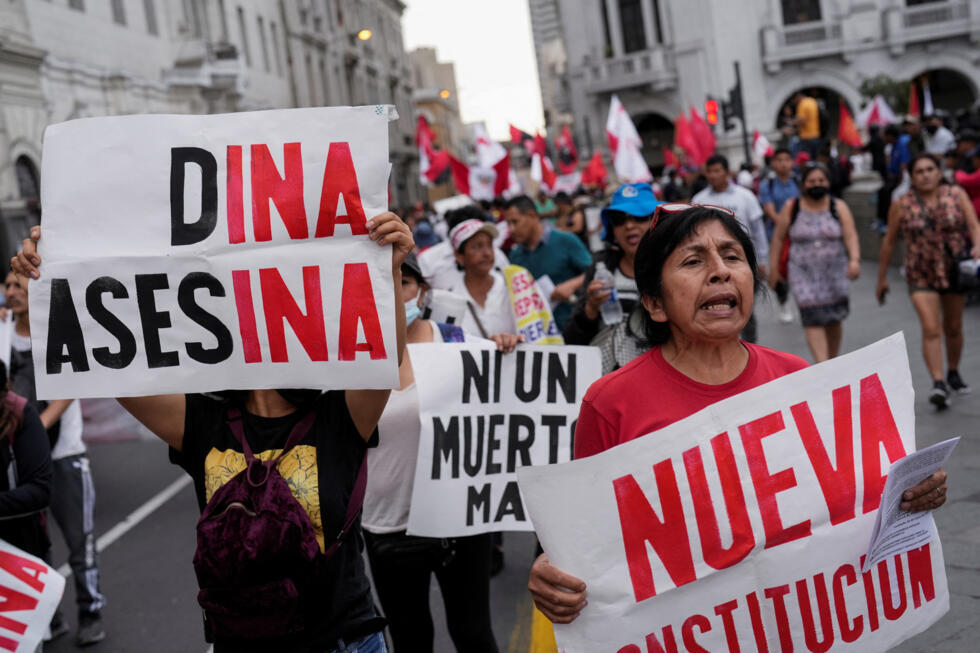 La popularidad de Boluarte, la sexta presidenta en siete años, se ha hundido y permanece en menos del 10 %, según una encuesta de Datum. Manifestantes portaban afiches contra la corrupción y el crimen organizado.