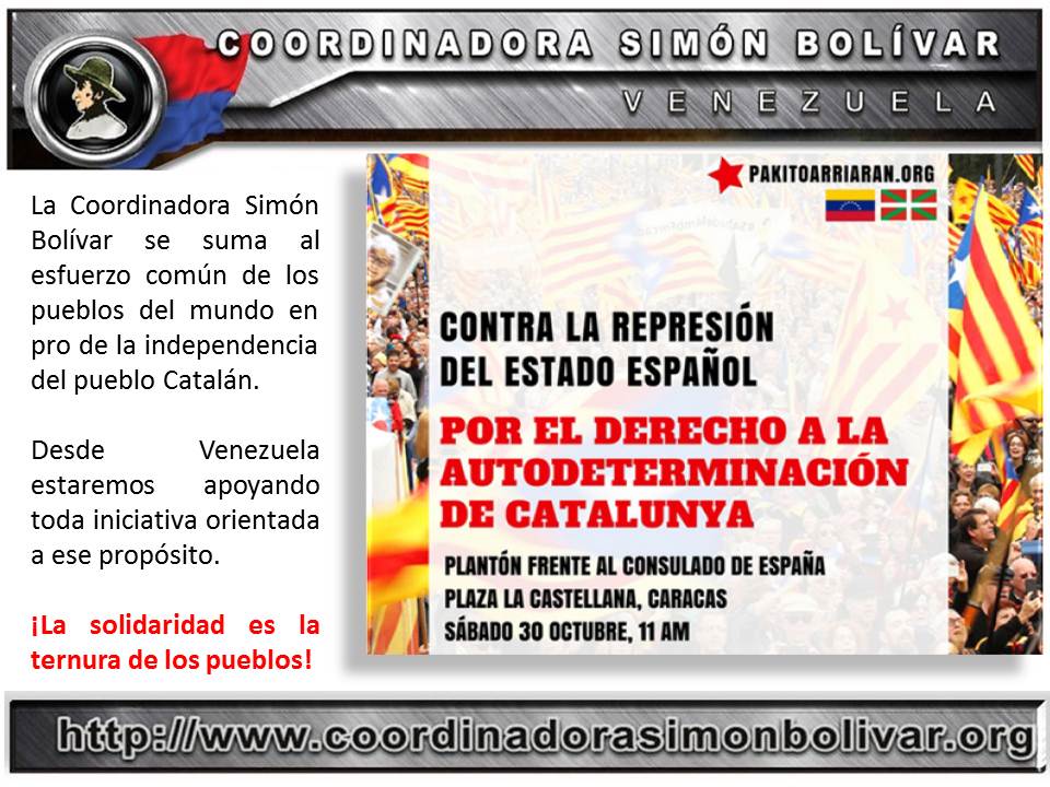 La Coordinadora Simón Bolívar se suma de manera activa e irrestricta al movimiento revolucionario mundial que respalda el derecho a decidir de Catalunya ante el advenimiento del referéndum que se celebrará el domingo 1 de octubre, y en el cual, el Estado español, busca frenar ese derecho a la autodeterminación de la población catalana por el camino de la represión.