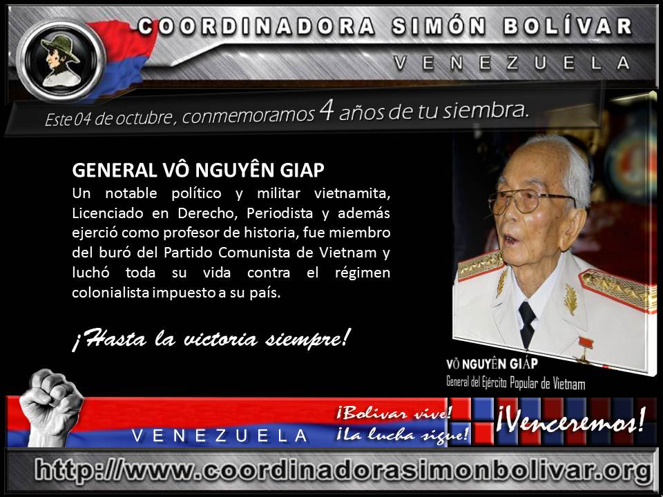 Éste cuatro (4) de octubre, se conmemoran cuatro (04) años de la siembra del General Vô Nguyên Giap, quien fuera un notable político y militar vietnamita. Se licenció en derecho y ejerció como profesor de historia, también fue periodista, Ministro del Interior, jefe militar del Việt Minh, jefe del Ejército Popular de Vietnam y Ministro de Defensa. Asimismo fue miembro del buró del Partido de los Trabajadores de Vietnam, el cual se transformó luego en el Partido Comunista de Vietnam.