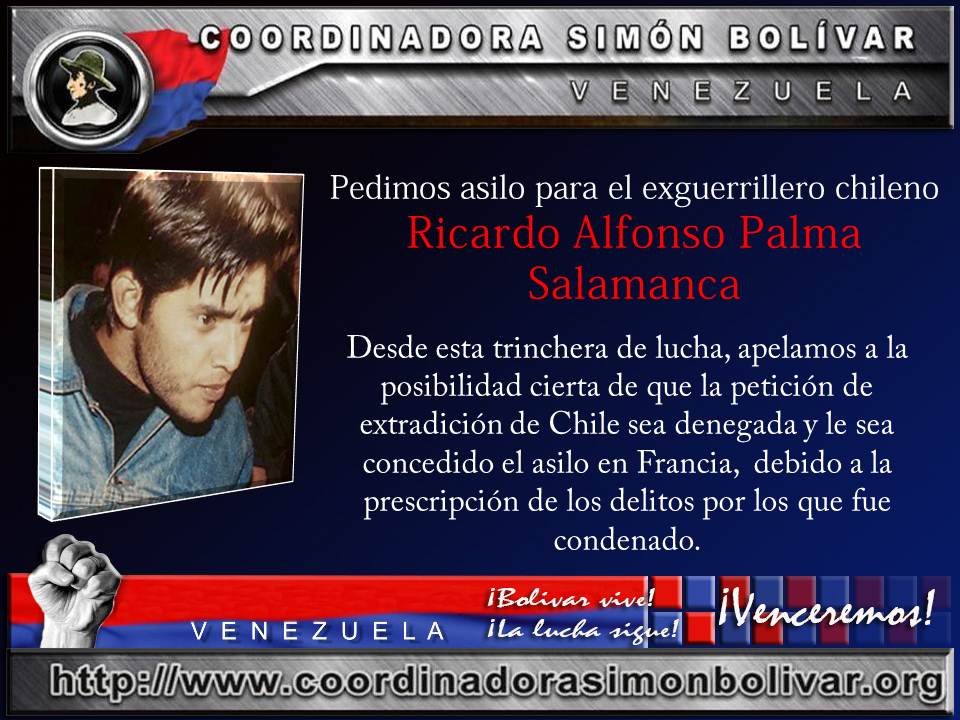 Ante la posibilidad cierta de que sean vulnerados sus derechos humanos, y el ser sometido a torturas que pudieran causarle la muerte en Chile, solicitamos en carta abierta asilo para el exguerrillero chileno Ricardo Alfonso Palma Salamanca, ello como garantía de que se le lleve a cabo un proceso de enjuiciamiento justo, transparente, sin condenas desvirtuadas ante posturas de odio, recelo, hostilidad y rechazo , y más importante aún con derecho a una legítima defensa, como lo merece cualquier ciudadano del mundo.