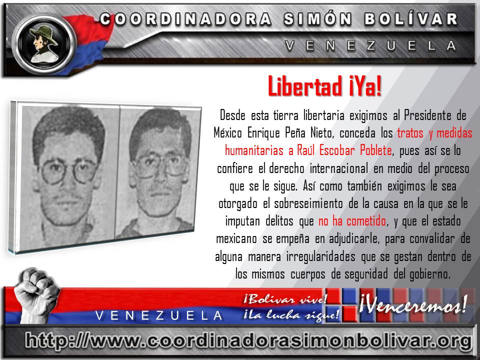 Desde esta tierra libertaria exigimos al Presidente de México Enrique Peña Nieto, conceda los tratos y medidas humanitarias a Raúl Escobar Poblete, pues así se lo confiere el derecho internacional en medio del proceso que se le sigue. Así como también exigimos le sea otorgado el sobreseimiento de la causa en la que se le imputan delitos que no ha cometido, y que el estado mexicano se empeña en adjudicarle, para convalidar de alguna manera irregularidades que se gestan dentro de los mismos cuerpos de seguridad del gobierno. Libertad ¡Ya!