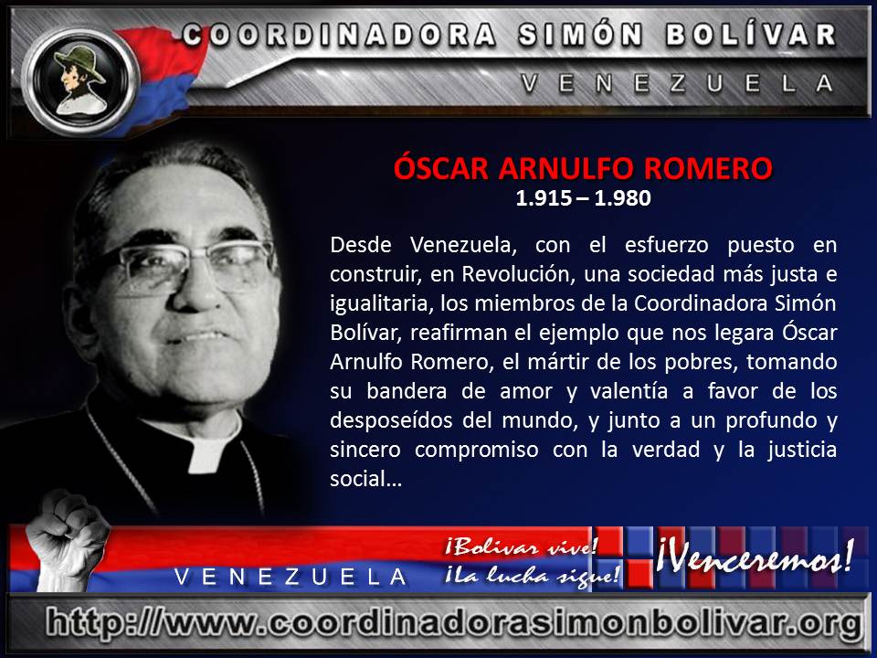 Desde Venezuela, con el esfuerzo por construir, en Revolución, una sociedad más justa e igualitaria, los miembros de la Coordinadora Simón Bolívar, reafirman el ejemplo que nos legara Óscar Arnulfo Romero, el mártir de los pobres, tomando su bandera de amor y valentía a favor de los desposeídos del mundo, y junto a un profundo y sincero compromiso con la verdad y la justicia social, decimos: ¡Venceremos!