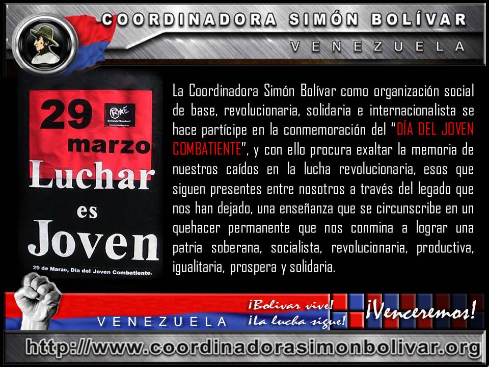 Hoy la Coordinadora Simón Bolívar como organización social de base, revolucionaria, solidaria e internacionalista se hace partícipe de la conmemoración del "DÍA DEL JOVEN COMBATIENTE", y con ello procuramos exaltar la memoria de nuestros caídos en la lucha revolucionaria, esos que siguen presentes entre nosotros a través del legado que nos han dejado, una enseñanza que se circunscribe en un quehacer permanente que nos conmina a lograr una patria soberana, socialista, revolucionaria, productiva, igualitaria, prospera y solidaria.