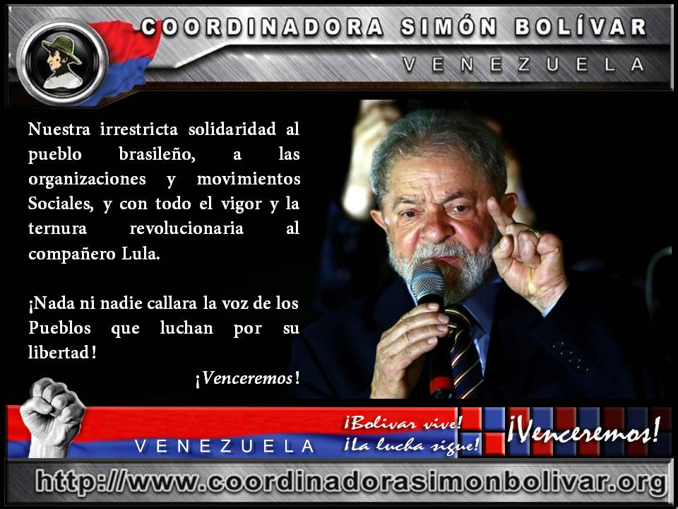 La Coordinadora Simón Bolívar, se solidariza con el camarada, amigo y ex presidente Luis Ignacio Lula da Silva, ante el arbitrario e injusto fallo del Tribunal Supremo de Justicia de Brasil el cual tiene como fin último impedir la voluntad del pueblo, en su lucha por la retoma del poder de las fuerzas populares y revolucionarias de ese país.
