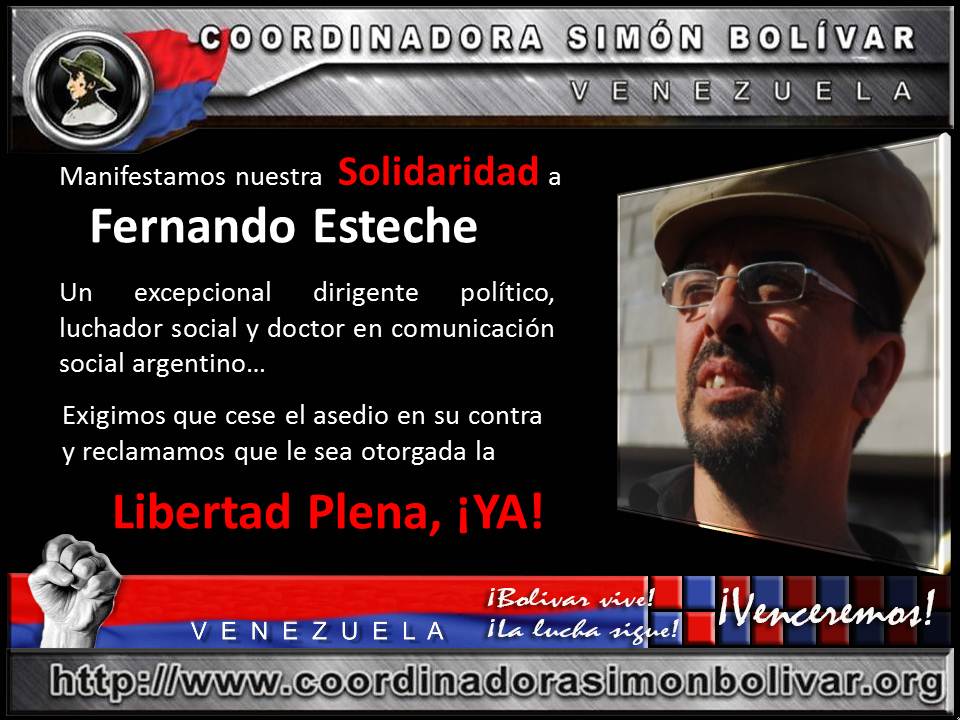 Desde la Coordinadora Simón Bolívar manifestamos en carta abierta que "La solidaridad es la ternura de los pueblos". Desde Venezuela ¡Nos hacemos solidarios con la lucha que libra Fernando Esteche!