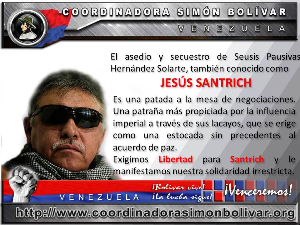 La casa de Santrich, al centro oriente de Bogotá, fue allanada y se espera que se esclarezca su infundada participación en el presunto delito de conspiración para exportar cocaína a Estados Unidos, que injuriosamente fue empuñada luego de la firma del acuerdo, con miras a justificar el dar una patada a la mesa de negociaciones, como una patraña más propiciada por la influencia imperial a través de sus lacayos, atropello que se erige como una estocada sin precedentes al acuerdo de paz.