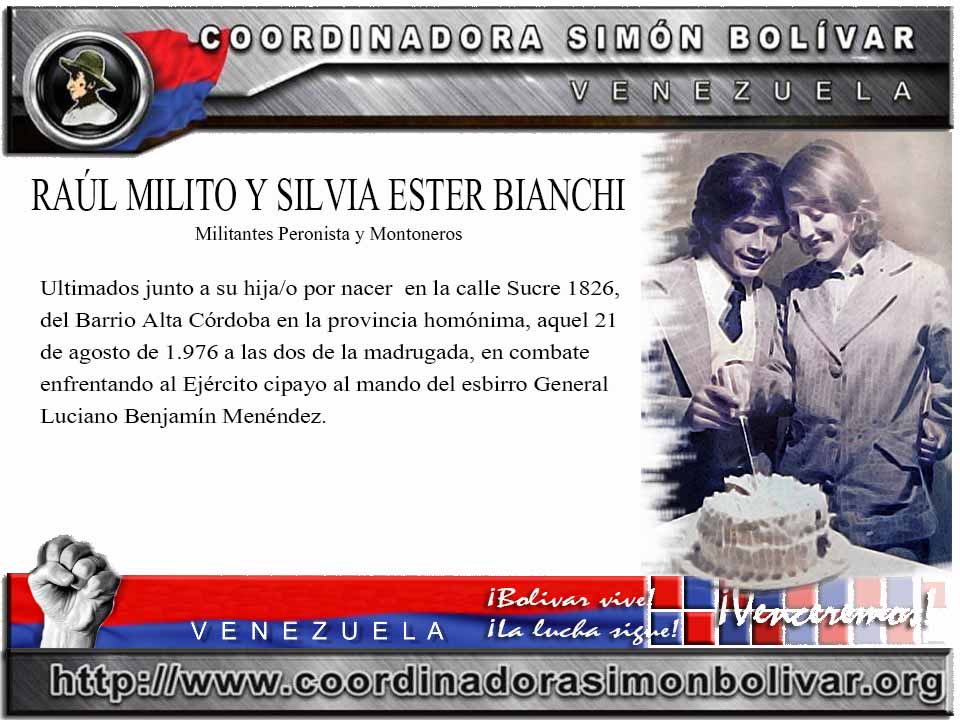Este 21 de Agosto se cumplen 42 años del fusilamiento del camarada RAÚL ENRIQUE MILITO, su compañera SILVIA ESTER BIANCHI y el hijo de ambos, con 9 meses de gestación, "Juanchi", por el grupo paramilitar Libertadores de América de Córdoba, bajo el mando de Luciano Benjamin Menéndez.