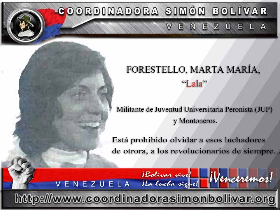 Para nosotros desde esta trinchera de lucha está prohibido olvidar a esos luchadores de otrora, a los revolucionarios de siempre, tal es el caso de Forestello, Marta María, también conocida como "Lala". Militante de Juventud Universitaria Peronista (JUP) y Montoneros.