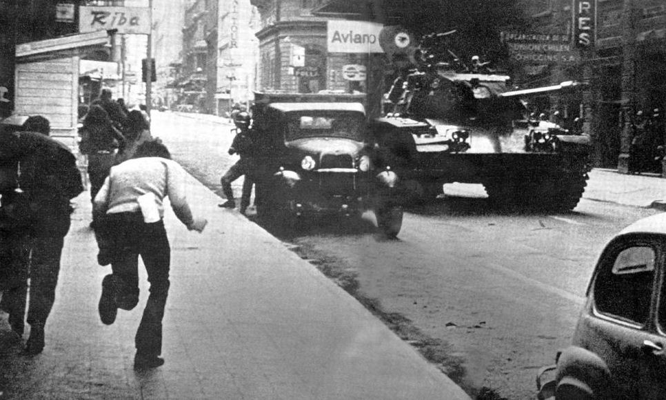 Hubo disparos a granel desde los edificios circundantes y los uniformados respondieron con nutrida artillería liviana. Nuevos elementos militares hicieron su irrupción y en pocos minutos la Alameda simulaba ser el patio interior de un regimiento preparando la Parada Militar. Camiones blindados, jeeps, tanques, obuses, ametralladoras.....ese era el nuevo paisaje de la céntrica avenida.