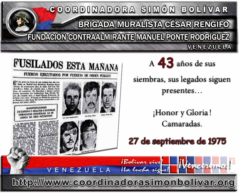 A un año más de aquellos últimos fusilamientos franquistas, que levantaron una fuerte oleada de protestas por todo el mundo, conmemoramos la siembra de aquellos valientes revolucionarios, que ofrendaron sus vidas en nombre de la libertad, la justicia y el levantamiento de los pueblos oprimidos.