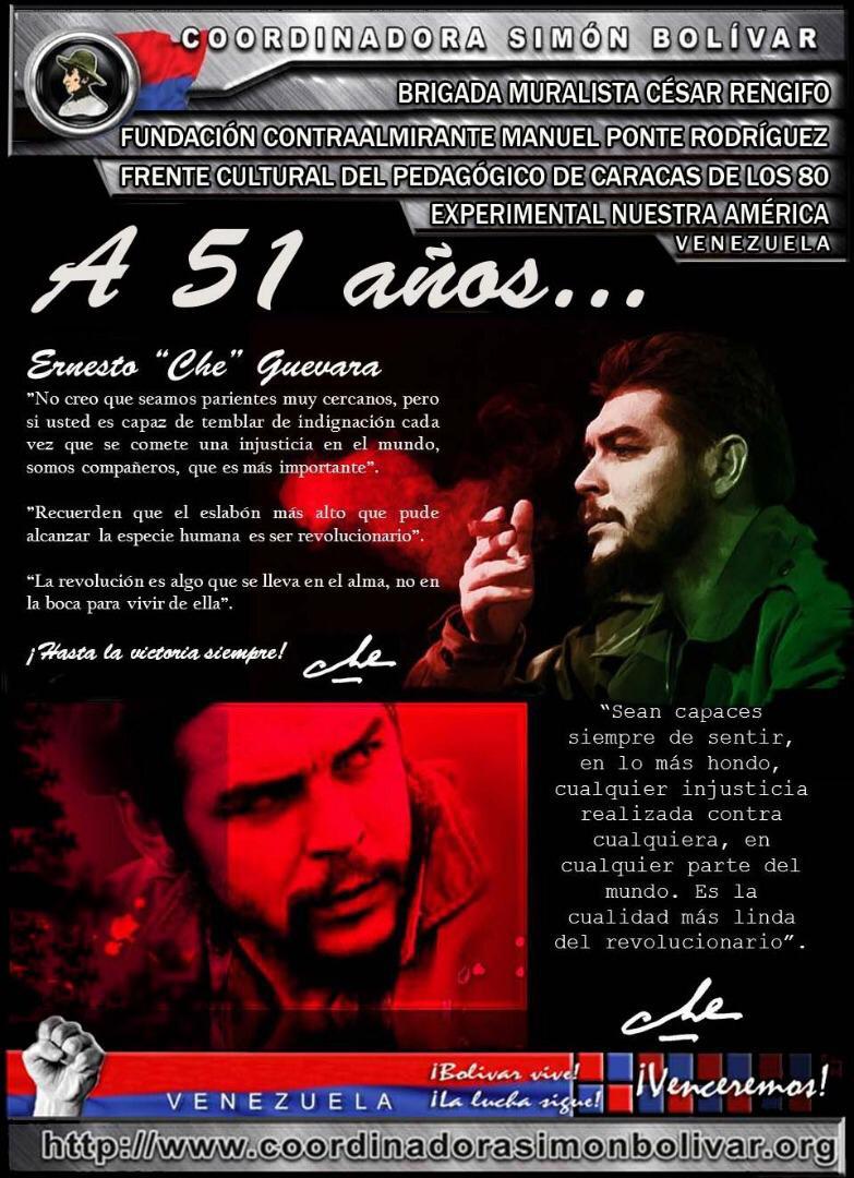A cincuenta y un años de su siembra, reivindicamos la memoria de Ernesto Guevara "El Che" (14 de mayo de 1928 - 9 de octubre de 1967), quien fue un político, escritor, periodista y médico. Uno de los ideólogos y comandantes de la Revolución cubana (1953-1959).