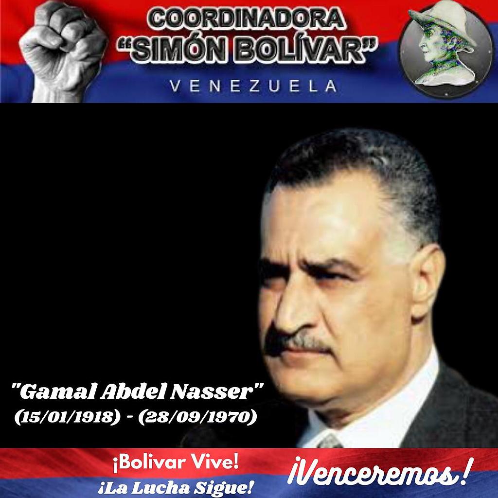 La Coordinadora Simón Bolívar rinde homenaje a Gamal Abdel Nasser fue un militar y estadista egipcio y el principal líder político árabe de su época, conocido impulsor del panarabismo y del socialismo árabe. Ocupó el cargo de presidente de Egipto desde 1954 hasta su muerte en 1970.