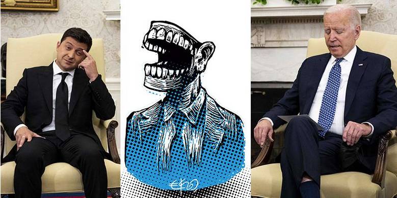 La estratagema preferida actualmente por el Dr. Strangelove nuclear consiste en apelar a los inmensos egos de los presidentes y sus intereses electorales, cuando a cada uno le dice en sus arengas congresales que está destinado a ser el líder del mundo libre y que debe asumir su responsabilidad de ariete global contra la bestia Rusia. Así sucedió en sus recientes performances, con guiones de tipo soap opera y reality show, ante el Congreso gringo, el parlamento inglés y el parlamento alemán, donde frotó con esa cursilería kitsch los egos de los títeres políticos del gran capítal Joseph Robinette Biden, Boris Johnson, Olaf Scholz y de la clase política burguesa congresal.