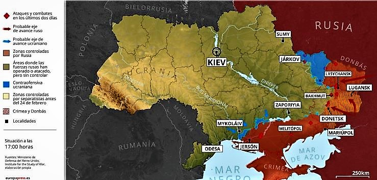 En abril del mismo año, en el este de Ucrania, las fuerzas separatistas tomaron el control de los edificios administrativos de Donetsk, Luhansk y Járkov, y convocaron referéndums sobre la independencia de estas regiones. Aunque las autoridades ucranianas recuperaron rápidamente el control de Járkov, no pudieron recuperar las regiones separatistas de Donetsk y Luhansk, y la contrarrevolución corrió el riesgo de extenderse a otras ciudades del sureste. El gobierno ucraniano respondió a la creación de las Repúblicas Populares de Donetsk y Luhansk (que declararon su independencia en mayo) lanzando una operación antiterrorista (ATO) con combates que duraron hasta febrero de 2015, fecha del acuerdo de Minsk II. Aunque este acuerdo contribuyó a una disminución significativa de la intensidad de los combates, conoció, como se sabe, el mismo fracaso que el primer acuerdo de septiembre de 2014. Antes de la invasión de febrero de 2022, la guerra ya se había cobrado más de 13.000 vidas y casi 2 millones de refugiados (Melnyk, 2022).