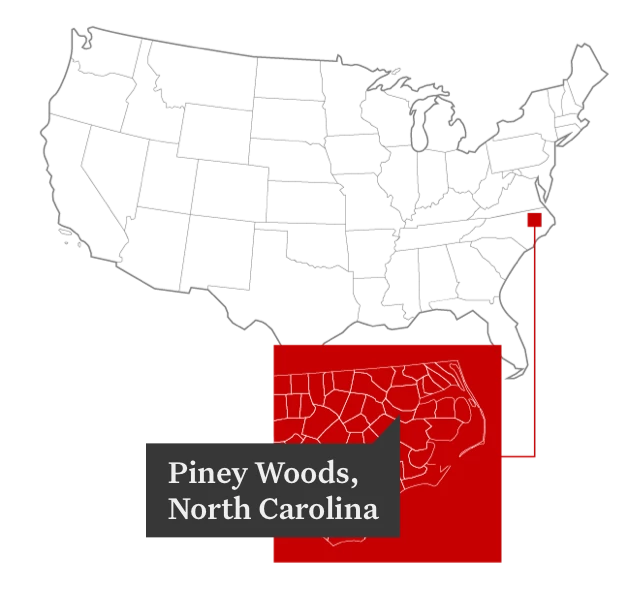Piney Woods, Carolina del Norte, es una de esas comunidades rurales pequeñas y tranquilas con las que puede pasar en un viaje hacia el norte. Bloques de frondosos pastos, tierras de cultivo y bosques están divididos en dos por una sola carretera asfaltada; no es raro encontrar una o dos tortugas holgazaneando en la calle vacía, sin miedo al tráfico potencial.