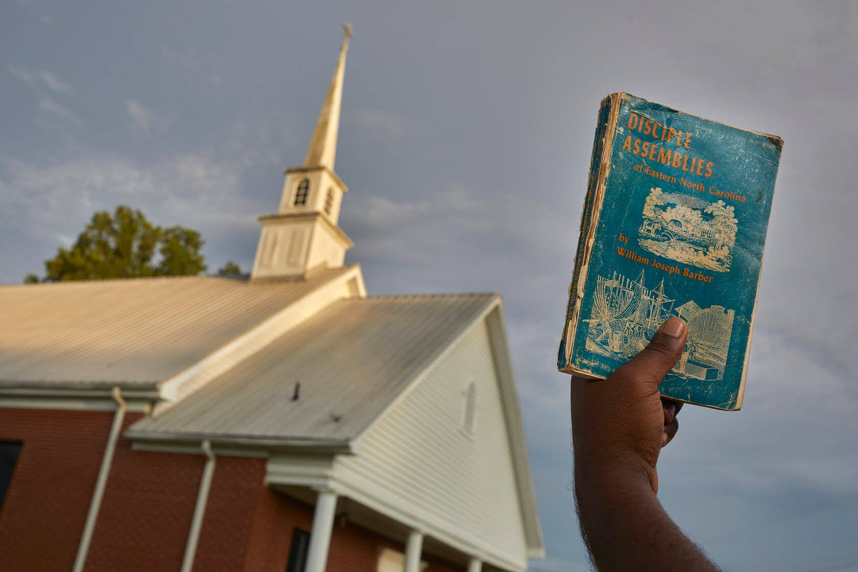 William Barber III sostiene el libro que escribió su abuelo William Barber, que documenta las Asambleas de discípulos en el este de Carolina del Norte en la Iglesia de Cristo de Uniontown en Jamesville, NC (Justin Cook para The Margin)