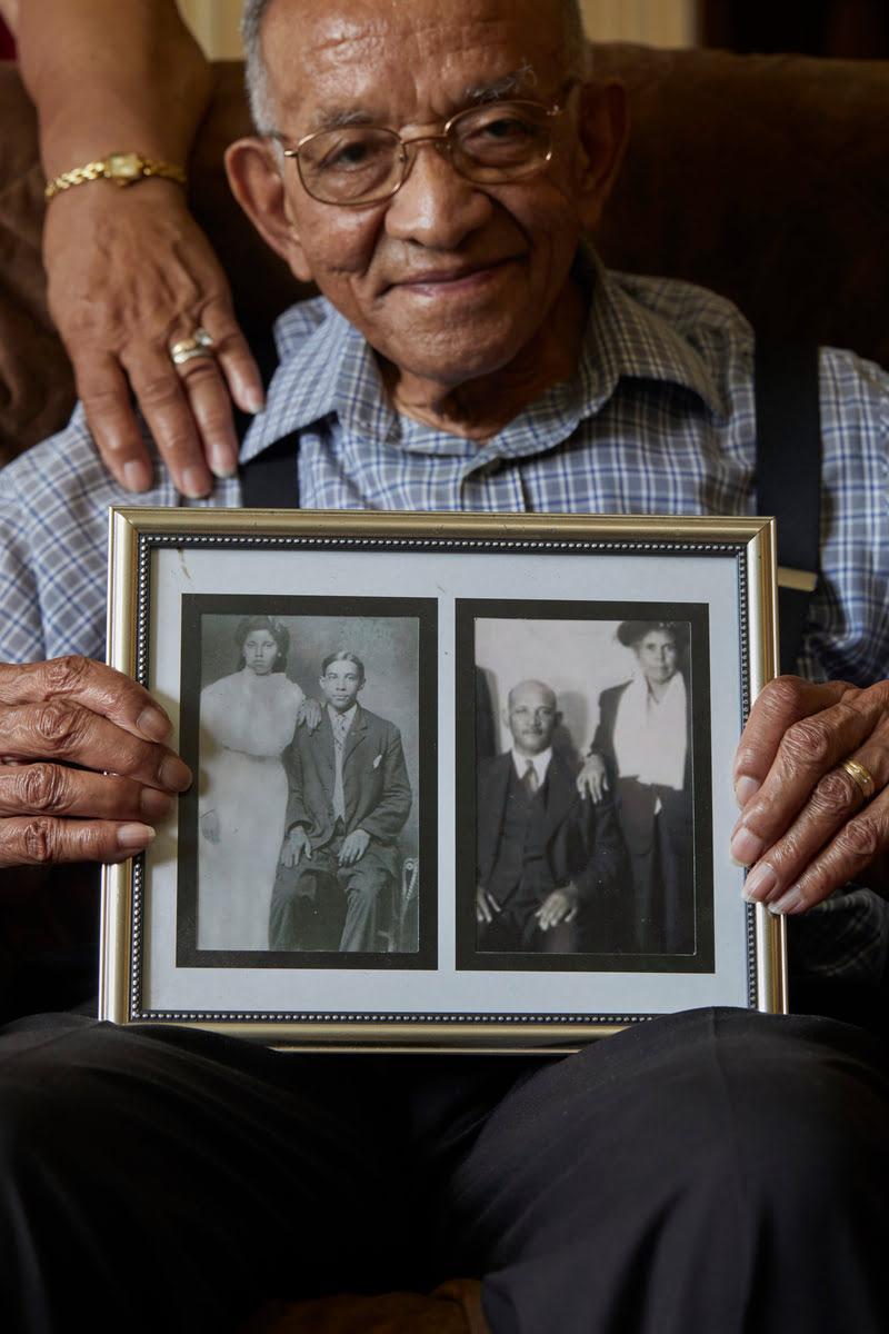 Douglas James y fotos de sus bisabuelos (de izquierda a derecha): Lucretia James y Stuart James y abuelos (de izquierda a derecha): Joseph James y Odella Keyes James. Sus abuelos alguna vez fueron dueños de la tierra que ahora es Vera Brown Farm en Jamesville, NC (Justin Cook para The Margin)