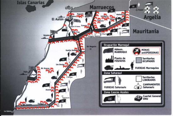 El muro, de 2720 kms de largo, es el más largo del mundo. Fue construido por la monarquía marroquí, con apoyo de Israel y los EEUU, en varias etapas entre 1980 y 1987, y delimita físicamente los territorios saharahuis ocupados. Está rodeado por más de 6 millones de minas antipersonales, y es supervisado por 160 mil soldados del ejército invasor.