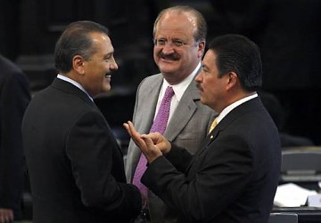 Los legisladores Manlio Fabio Beltrones Rivera, del Partido Revolucionario Institucional; así como Graco Ramírez Garrido Abreu y Carlos Navarrete Ruiz, del de la Revolución Democrática, durante la sesión de este martes en la Cámara de Senadores
