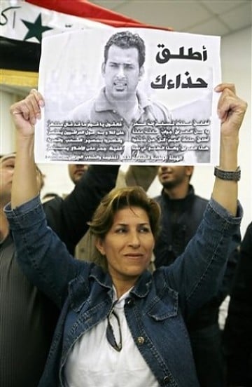 En plena rueda de prensa en la noche del domingo en Bagdad, Muntazer al Zaidi, de 29 años, periodista del canal de televisión al Bagdadia, lanzó sus dos zapatos contra el presidente Bush, que efectuaba una visita sorpresa a Irak, y le gritó: "Este es el beso del adiós, perro". Bush esquivó los dos zapatazos.