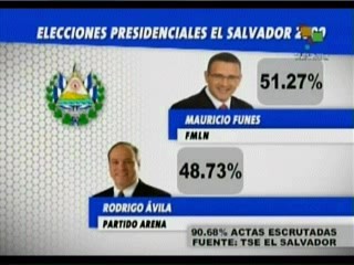 15 de marzo 2009.- El candidato por el Frente Farabundo Martí de Liberación Nacional (FMLN,) Mauricio Funes, obtuvo el 51,27 por ciento con un millón 231 mil 755 votos según el tercer boletín del Tribunal Supremo Electoral (TSE) salvadoreño que ha escrutado 85,70 por ciento de los sufragios.
