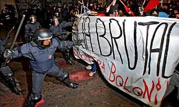 Por segunda ocasión en la jornada los cuerpos de seguridad reprimieron las protestas estudiantiles contra el Plan Bolonia, dejando un saldo de varios heridos, entre ellos reporteros gráficos de distintos medios. Los estudiantes consideran que este plan de la Unión Europea constituye una forma de privatización de la educación superior.