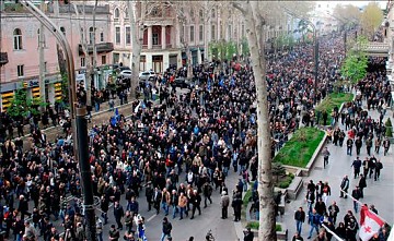 10 de abril 2009.- Miles de personas se congregaron este jueves en la avenida Rustaveli, en el centro de la capital georgiana, para exigir la dimisión del presidente, Mijaíl Saakashvili .