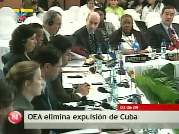 El jefe de prensa de la cancillería venezolana, Martín Pacheco, informó que se aprobó la propuesta formulada por los cancilleres de los países del ALBA, más Ecuador y Paraguay, que da marcha atrás con la vergonzosa expulsión de Cuba en 1962 por parte de los países miembros de la Organización de Estados Americanos, apuntalados por Estados Unidos. Ahora depende de Cuba su decisión de reingresar o no.