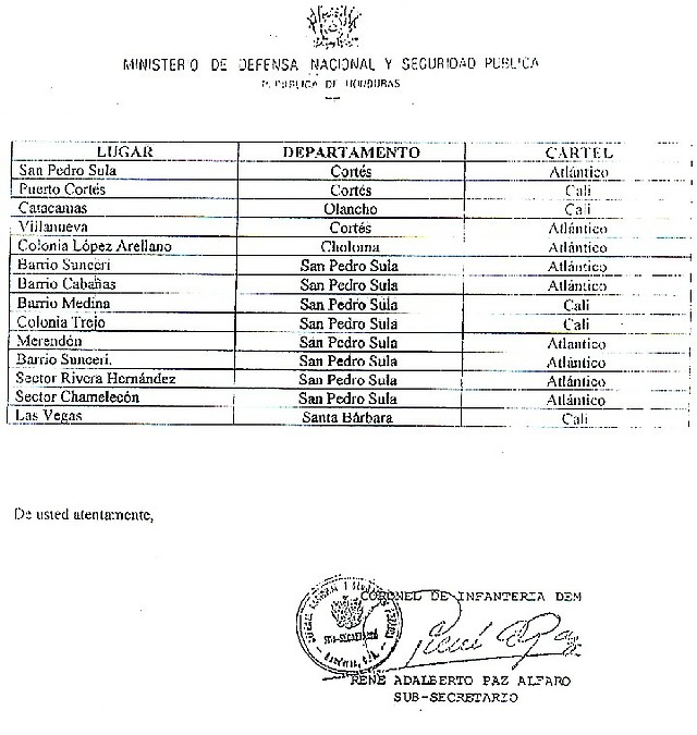 El documento - reproducido por el sitio web cubadebate.cu - firmado por el Coronel de infantería René Adalberto Paz Alfaro y llevando el membrete del ministerio, señala en el número SN-FF. AA. 060, a ROBERTO MICHELLETI BAIN – con el error de ortógrafo en Micheletti – con la “CONEXIÓN” Cartel de Cali y bajo la mención “LUGAR” la palabra “Yoro”.