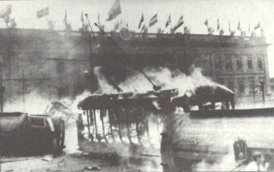 Alguien deambula en busca de un zapato. Una mujer aúlla con un niño muerto en brazos. La ciudad humea. Se camina con cuidado, por no pisar cadáveres. Un maniquí descuajaringado cuelga de los cables del tranvía. Desde la escalinata de un monasterio hecho carbón, un Cristo desnudo y tiznado mira al cielo con los brazos en cruz. Al pie de esa escalinata, un mendigo bebe y convida: la mitra del arzobispo le tapa la cabeza hasta los ojos y una cortina de terciopelo morado le envuelve el cuerpo, pero el mendigo se defiende del frío bebiendo coñac francés en cáliz de oro, y en copón de plata ofrece tragos a los caminantes. Bebiendo y convidando, lo voltea una bala del ejército.