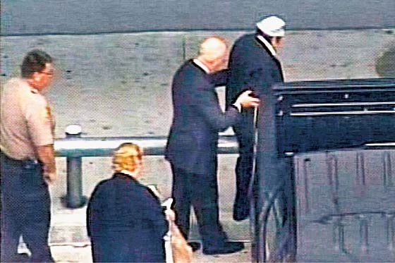 Noriega (sombrero blanco) encorvado, a su llegada al Aeropuerto Charles de Gaulle
